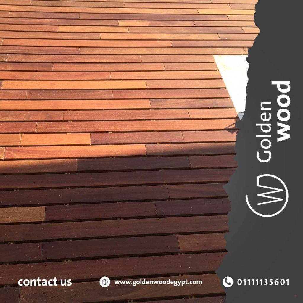 ارضيات خشب ضد الماء واشعة الشمس يستخدم هذا النوع من ارضيات الخشبية فىالحدائق و حول حمامات السباحه و علي اسطح المراكب و اسطح المنازل. و يتوفر في مقاس ( 30*30 سم) و بسمك 23 مم. يستخدم فيه نوعين من الاخشاب يتميزا بقدرتهم علي التعايش مع الشمس و المياه و هما ( التيك – الايروكو) و يتكون من طبقتين: الطبقي العليا: الخشب الصلب بسمك 12 مم و الذي يتم دهانه بزيوت اخشاب طبيعيه ليعطي مظهر جميل و يغلق مسام الخشب . الطبقه السفلي: عباره عن قاعده بلاستيكيه يتم تثبيت الاخشاب فوقها بواسطه مسمار(ستينليس ستيل) و يتم تثبيت البلاطات البلاستيكيه مع بعضها لتحقق الشكل المطلوب من قبل العميل .