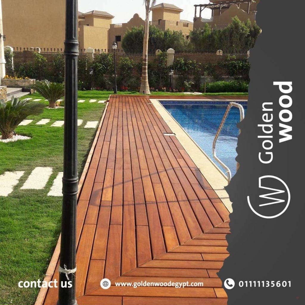 ارضيات خشب ضد الماء واشعة الشمس يستخدم هذا النوع من ارضيات الخشبية فىالحدائق و حول حمامات السباحه و علي اسطح المراكب و اسطح المنازل. و يتوفر في مقاس ( 30*30 سم) و بسمك 23 مم. يستخدم فيه نوعين من الاخشاب يتميزا بقدرتهم علي التعايش مع الشمس و المياه و هما ( التيك – الايروكو) و يتكون من طبقتين: الطبقي العليا: الخشب الصلب بسمك 12 مم و الذي يتم دهانه بزيوت اخشاب طبيعيه ليعطي مظهر جميل و يغلق مسام الخشب . الطبقه السفلي: عباره عن قاعده بلاستيكيه يتم تثبيت الاخشاب فوقها بواسطه مسمار(ستينليس ستيل) و يتم تثبيت البلاطات البلاستيكيه مع بعضها لتحقق الشكل المطلوب من قبل العميل .