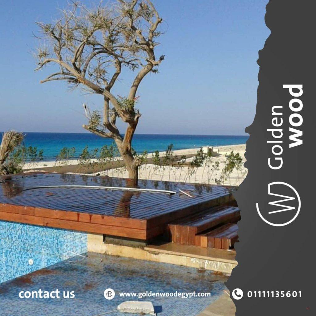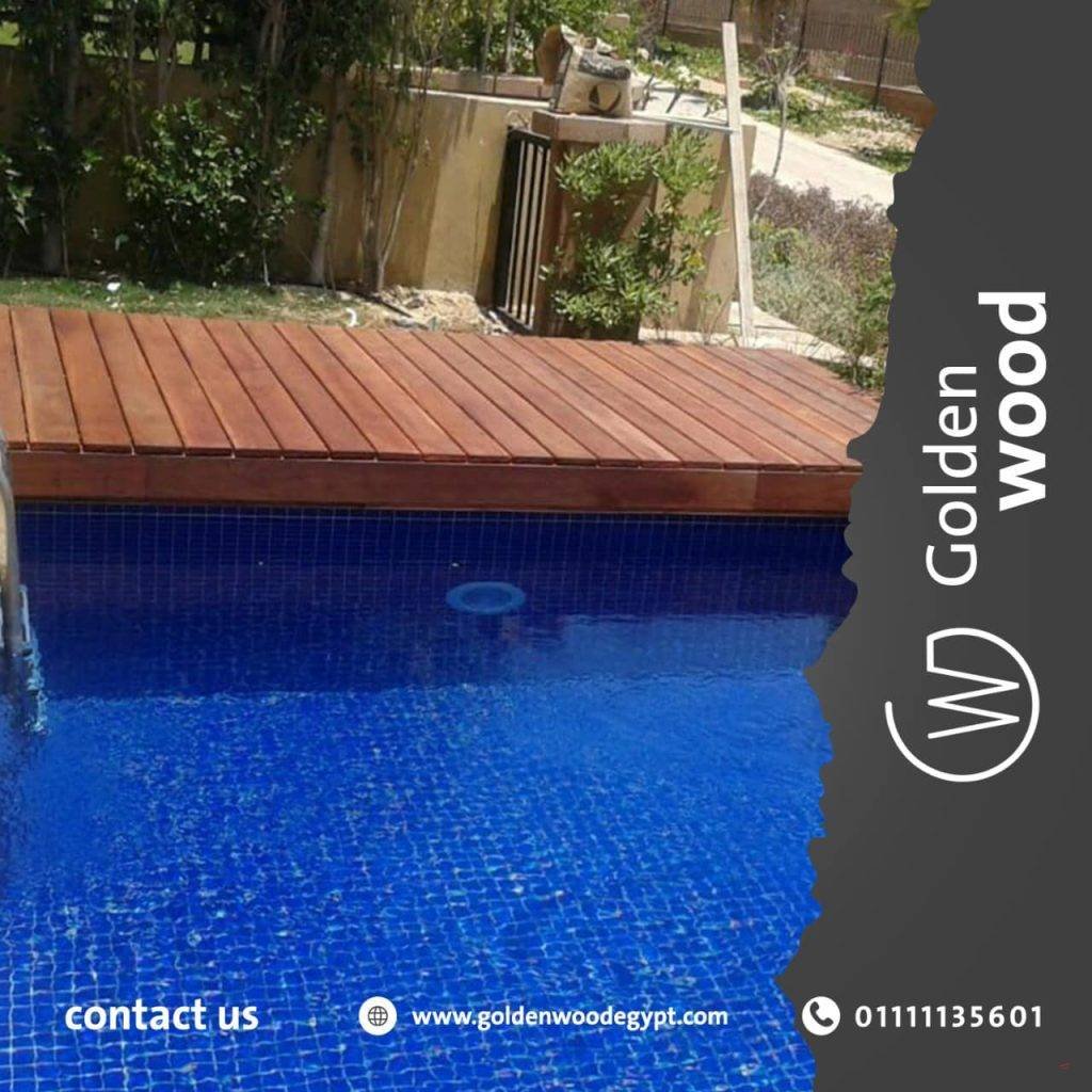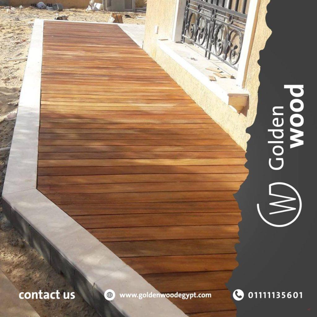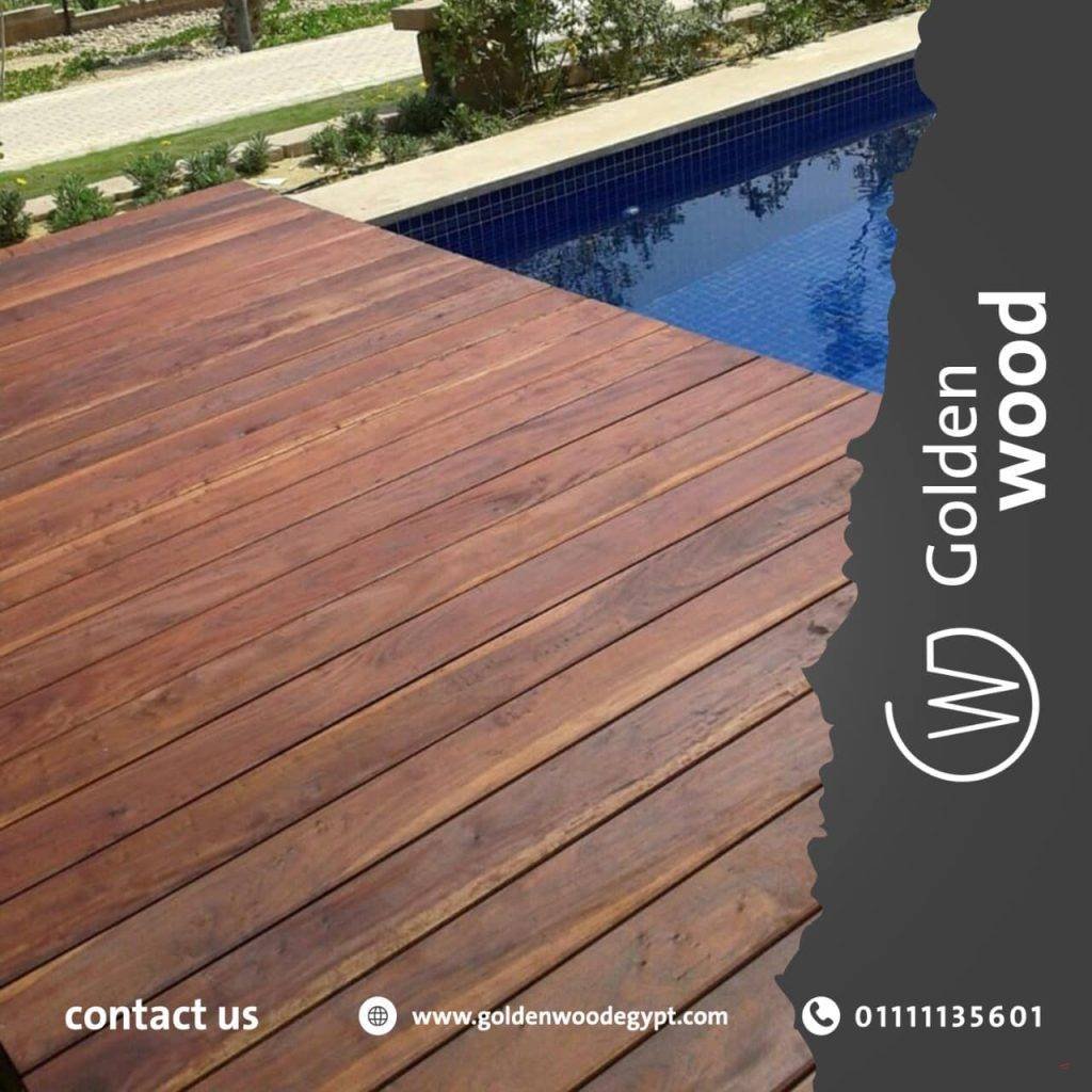 ارضيات خشب ضد الماء واشعة الشمس يستخدم هذا النوع من ارضيات الخشبية فىالحدائق و حول حمامات السباحه و علي اسطح المراكب و اسطح المنازل. و يتوفر في مقاس ( 30*30 سم) و بسمك 23 مم. يستخدم فيه نوعين من الاخشاب يتميزا بقدرتهم علي التعايش مع الشمس و المياه و هما ( التيك – الايروكو) و يتكون من طبقتين: الطبقي العليا: الخشب الصلب بسمك 12 مم و الذي يتم دهانه بزيوت اخشاب طبيعيه ليعطي مظهر جميل و يغلق مسام الخشب . الطبقه السفلي: عباره عن قاعده بلاستيكيه يتم تثبيت الاخشاب فوقها بواسطه مسمار(ستينليس ستيل) و يتم تثبيت البلاطات البلاستيكيه مع بعضها لتحقق الشكل المطلوب من قبل العميل .