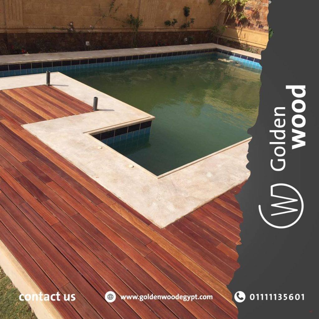 ارضيات خشب ضد الماء واشعة الشمس يستخدم هذا النوع من ارضيات الخشبية فىالحدائق و حول حمامات السباحه و علي اسطح المراكب و اسطح المنازل. و يتوفر في مقاس ( 30*30 سم) و بسمك 23 مم. يستخدم فيه نوعين من الاخشاب يتميزا بقدرتهم علي التعايش مع الشمس و المياه و هما ( التيك – الايروكو) و يتكون من طبقتين: الطبقي العليا: الخشب الصلب بسمك 12 مم و الذي يتم دهانه بزيوت اخشاب طبيعيه ليعطي مظهر جميل و يغلق مسام الخشب . الطبقه السفلي: عباره عن قاعده بلاستيكيه يتم تثبيت الاخشاب فوقها بواسطه مسمار(ستينليس ستيل) و يتم تثبيت البلاطات البلاستيكيه مع بعضها لتحقق الشكل المطلوب من قبل العميل .