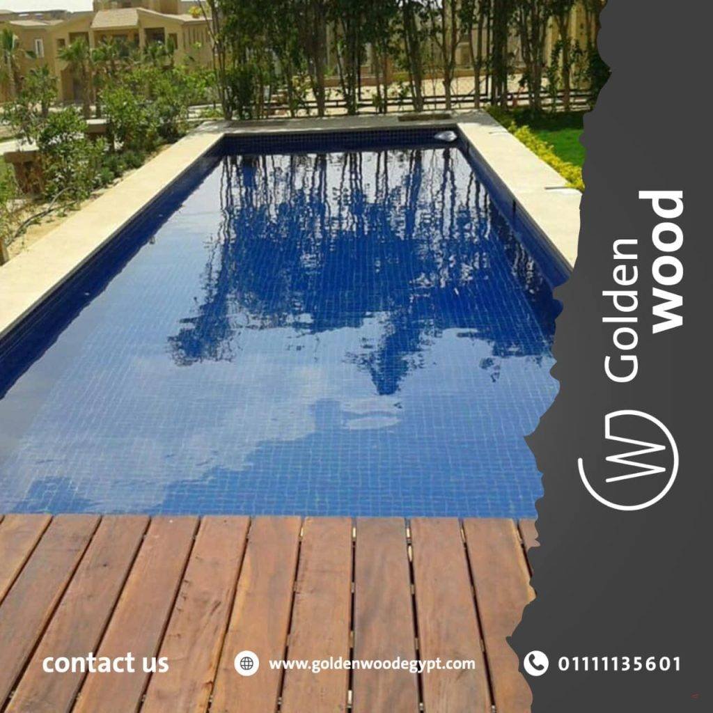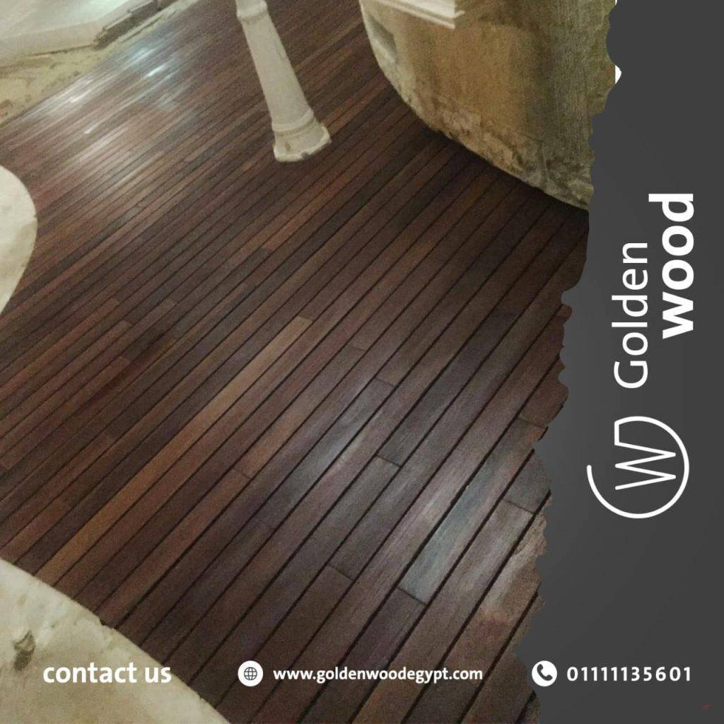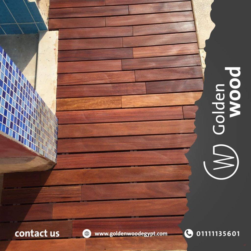 ارضيات خشب ضد الماء واشعة الشمس يستخدم هذا النوع من ارضيات الخشبية فىالحدائق و حول حمامات السباحه و علي اسطح المراكب و اسطح المنازل. و يتوفر في مقاس ( 30*30 سم) و بسمك 23 مم. يستخدم فيه نوعين من الاخشاب يتميزا بقدرتهم علي التعايش مع الشمس و المياه و هما ( التيك – الايروكو) و يتكون من طبقتين: الطبقي العليا: الخشب الصلب بسمك 12 مم و الذي يتم دهانه بزيوت اخشاب طبيعيه ليعطي مظهر جميل و يغلق مسام الخشب . الطبقه السفلي: عباره عن قاعده بلاستيكيه يتم تثبيت الاخشاب فوقها بواسطه مسمار(ستينليس ستيل) و يتم تثبيت البلاطات البلاستيكيه مع بعضها لتحقق الشكل المطلوب من قبل العميل .