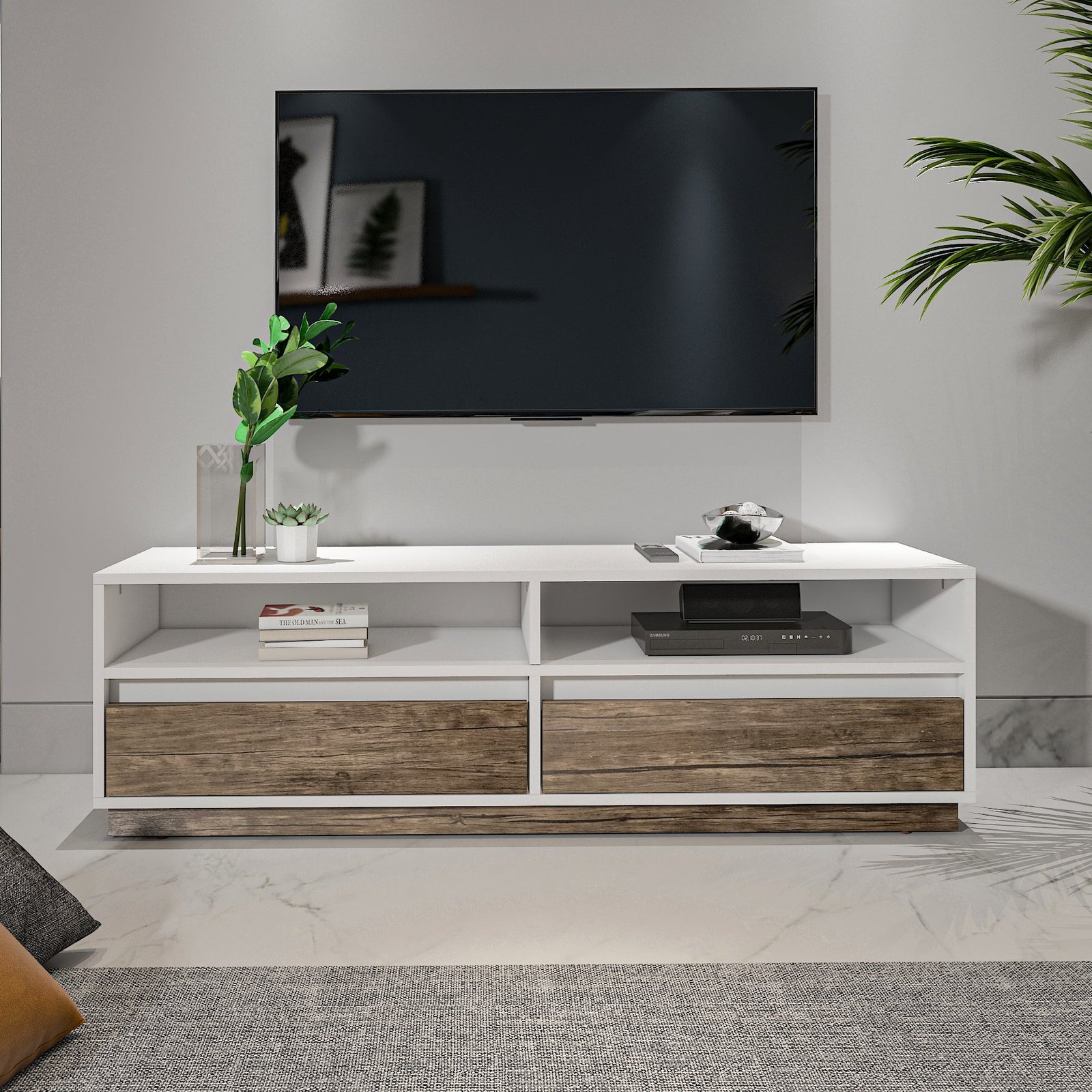 ترابيزة تليفزيون بتصميم مودرن ستغير من ديكور منزلك، مصنوعة من خشب عالي الجودة. احصل عليها للحفاظ على نظام المنطقة المحيطة بالتليفزيون