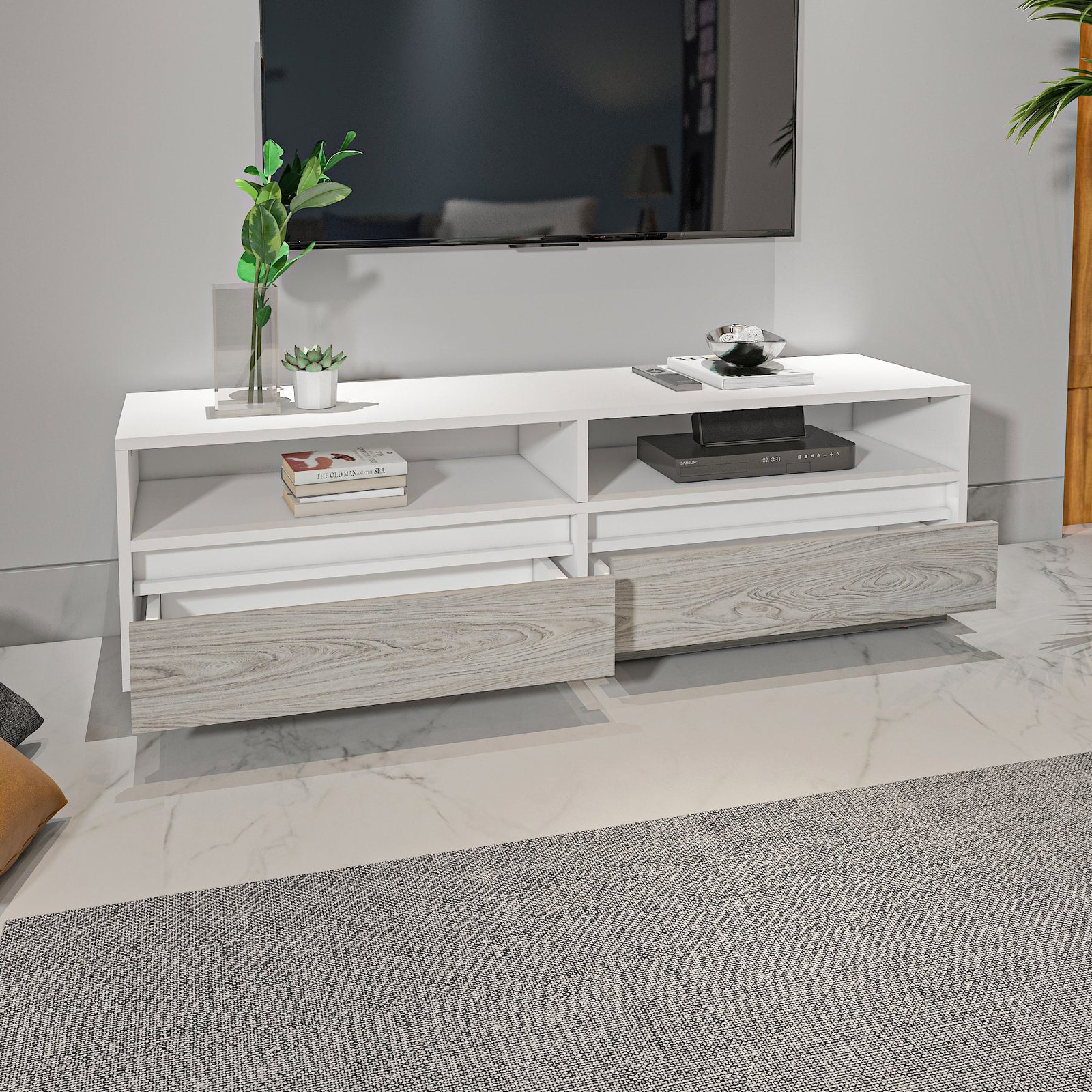 ترابيزة تليفزيون بتصميم مودرن ستغير من ديكور منزلك، مصنوعة من خشب عالي الجودة. احصل عليها للحفاظ على نظام المنطقة المحيطة بالتليفزيون