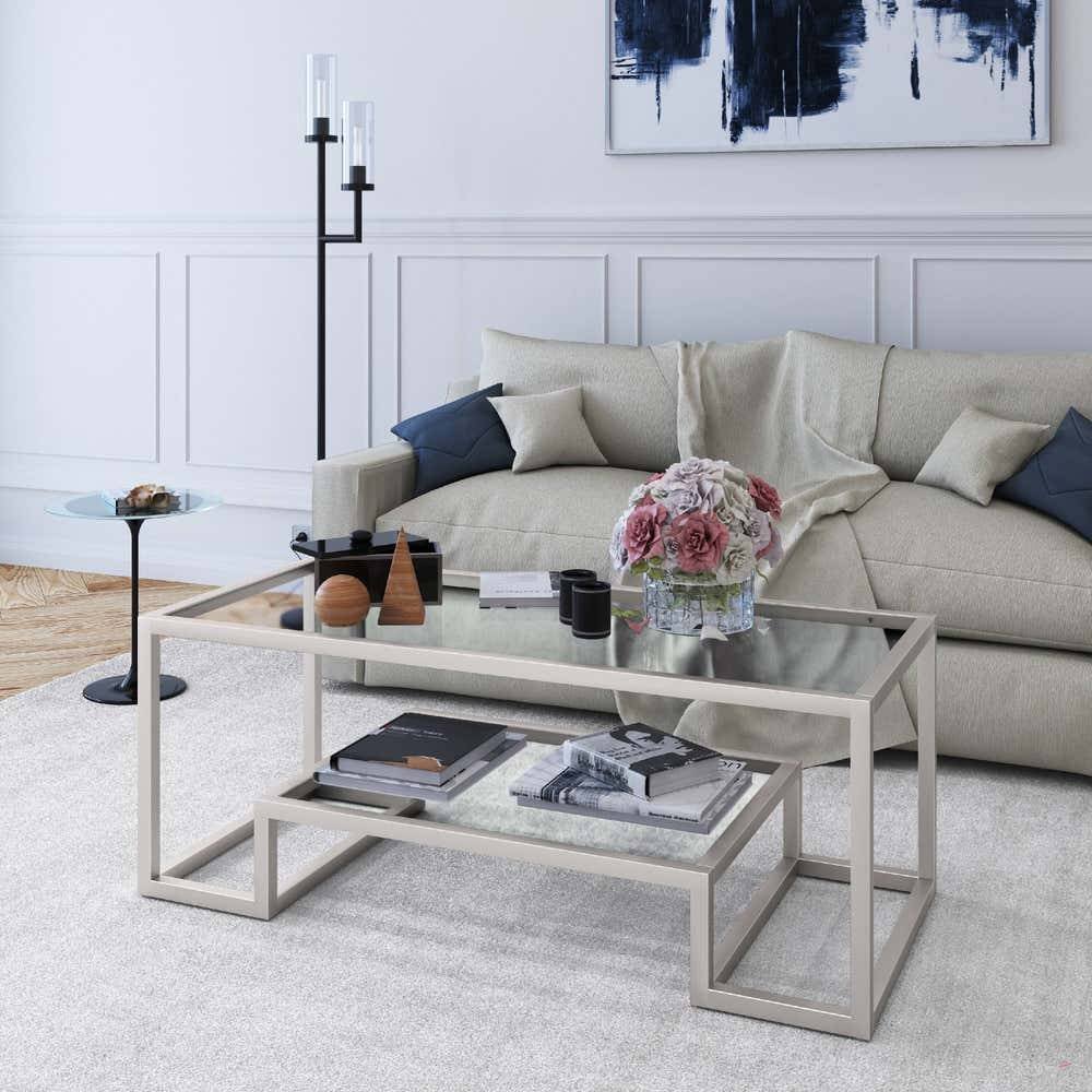 ترابيزة وسط مودرن ستيل، سطح زجاجي، 100×50×50 سم – فضي شفاف