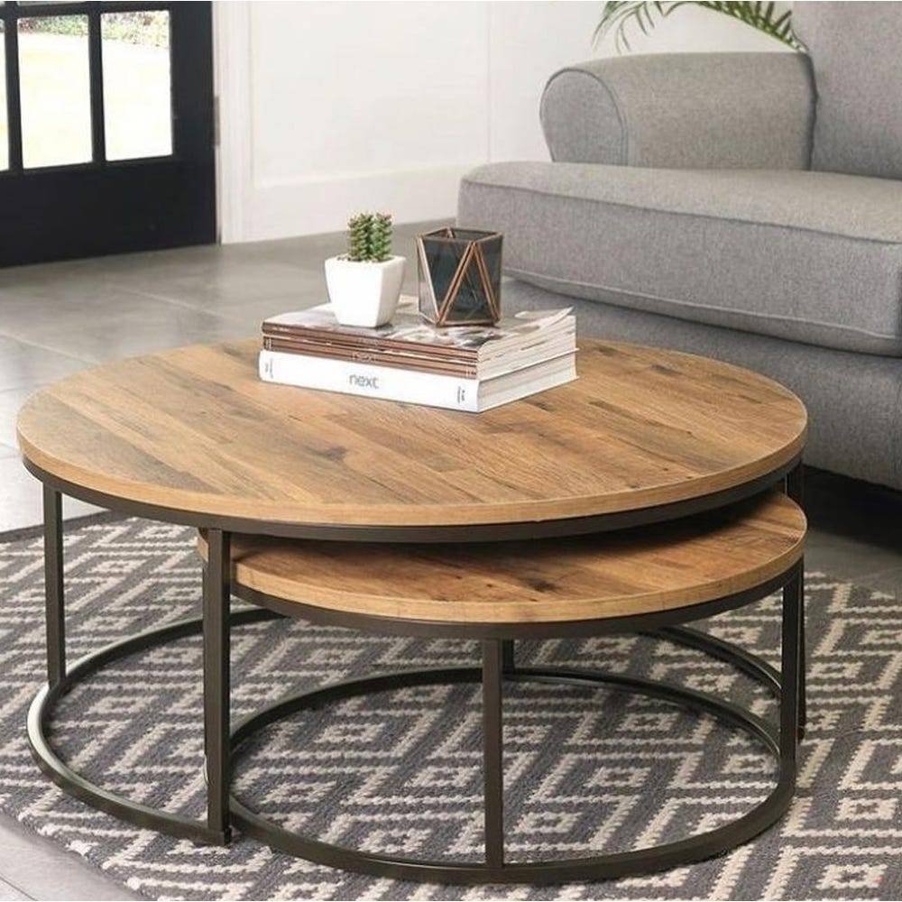 طقم ترابيزات وسط شكل دائري ستيل، قطعتين، سطح خشب – اسود خشبي
