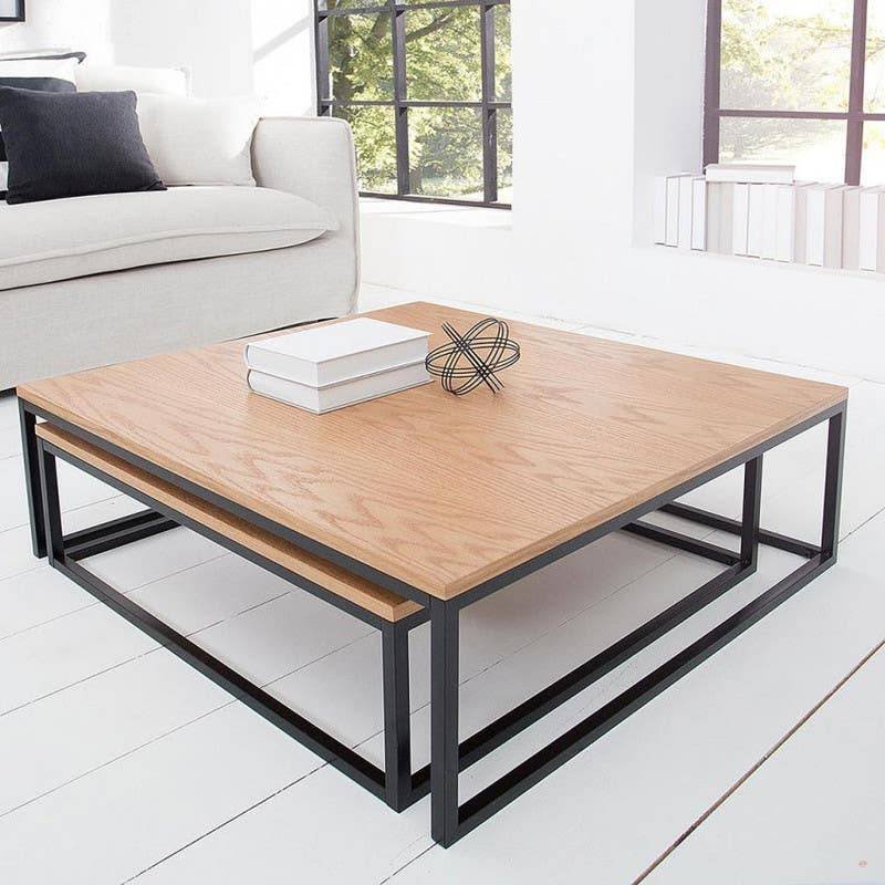 طقم ترابيزات وسط شكل مربع ستيل، قطعتين، سطح خشب – اسود خشبي