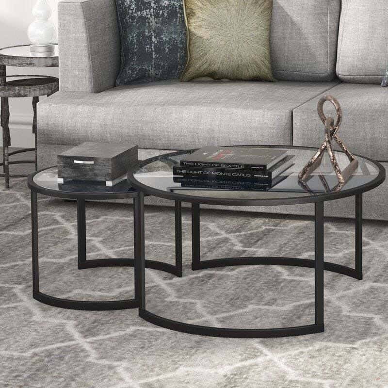 طقم ترابيزات وسط مودرن ستيل، 2 قطعة، سطح زجاجي، 70 × 70 × 45 سم – شفاف اسود