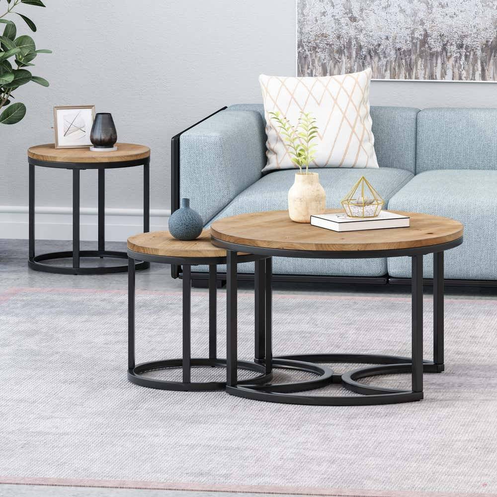 طقم ترابيزات وسط مودرن ستيل، 3 قطع، سطح خشبي ام دي اف، 70 × 70 × 45 سم – بني اسود