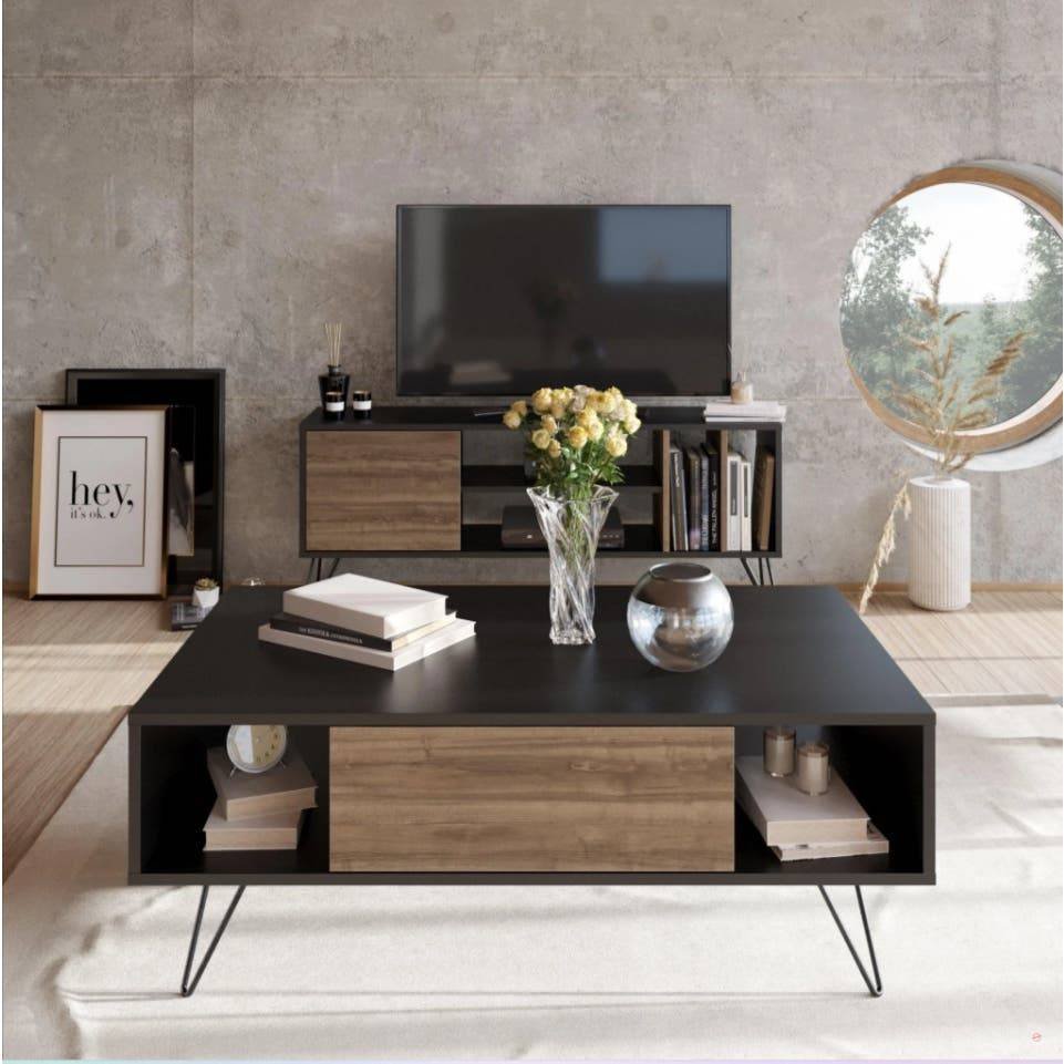 - وحدة تلفزيون من خشب ام دي اف عالي الجودة وطاولة قهوة بأبعاد: طول وحدة التلفزيون: 160 ، العمق: 30 ارتفاع: 50 وطاولة قهوة بطول: 80 ، عمق: 50 ارتفاع: 45.