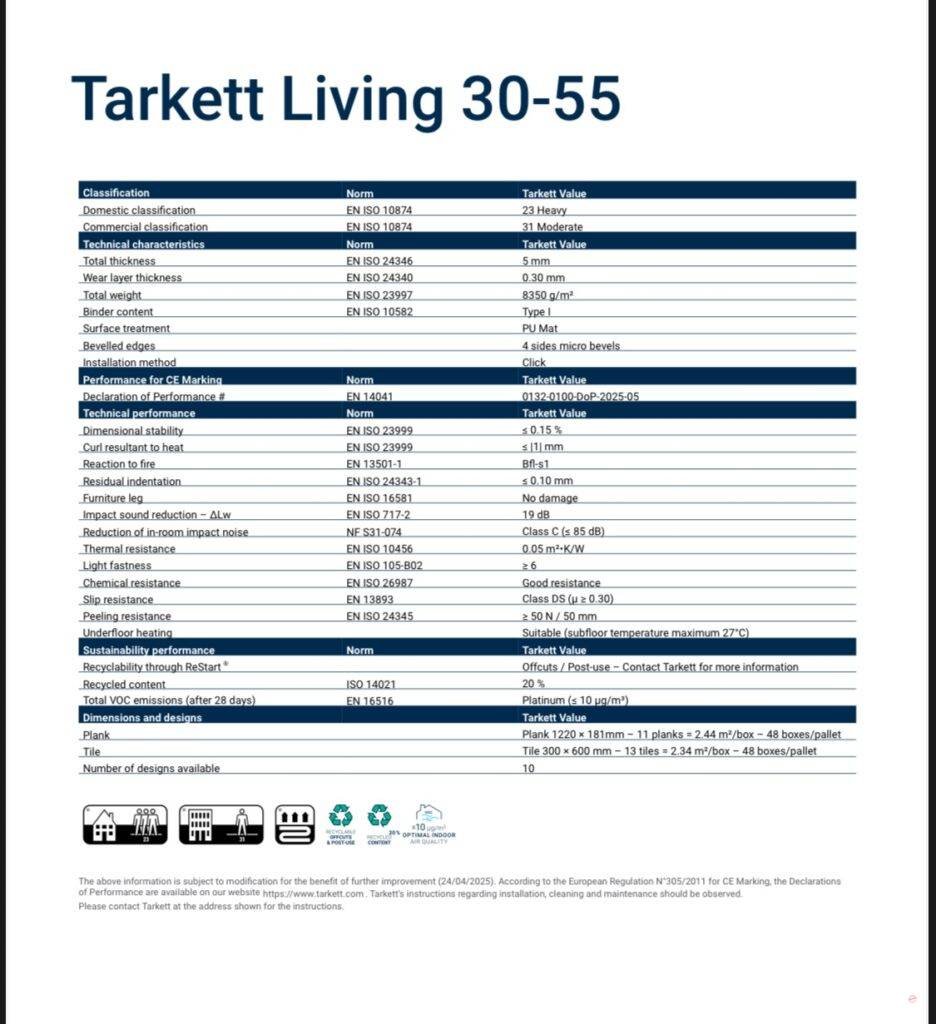 Tarkett Living 30-55 منتج بيستحق سعره. مش أرخص حاجة في السوق، لكنه بيديك قيمة حقيقية: ضمان 15 سنة، عزل صوت مدمج، مقاومة مياه كاملة، وشهادة VOC Platinum اللي بتضمن إن الهواء في بيتك هيفضل نظيف.